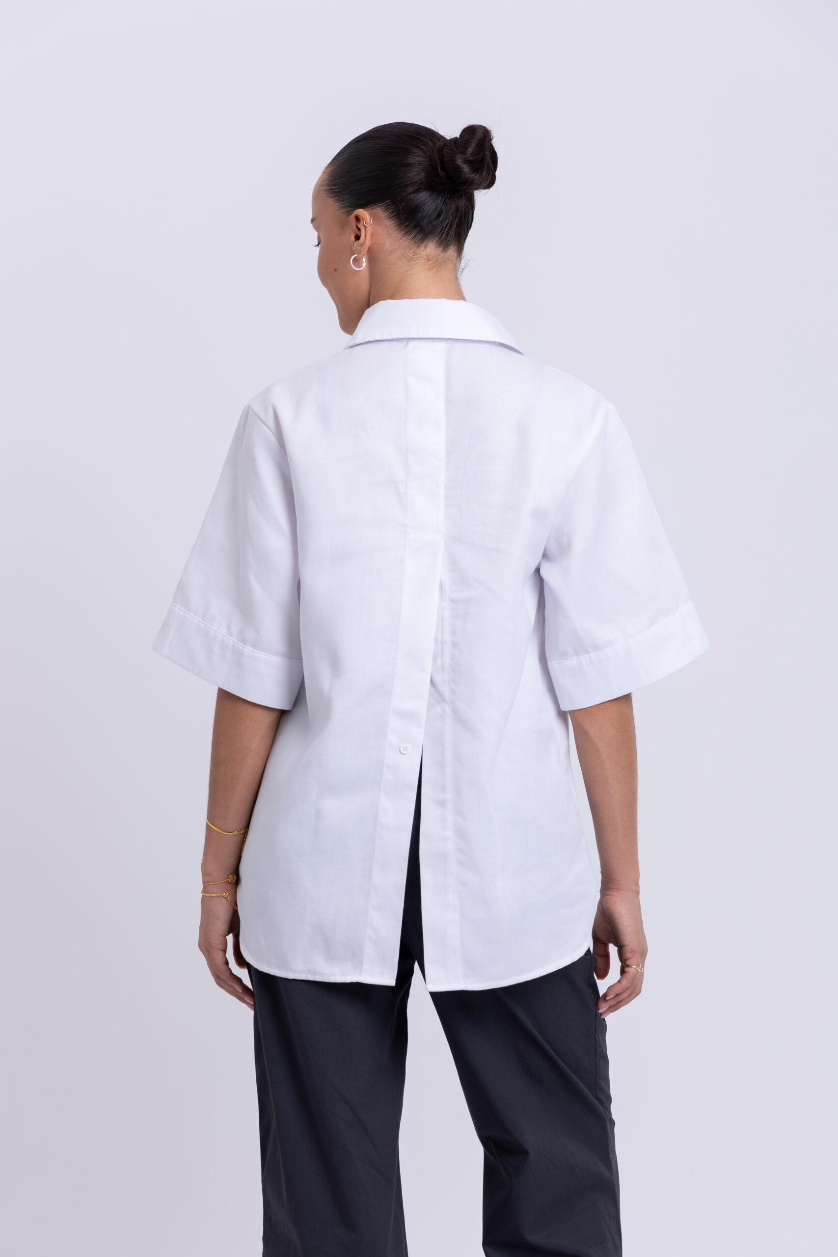 Loose, feminine fit for effortless comfort and movement. Wide neck collar adds a soft, modern design touch. Back vent detail can be worn open or closed with a single button for versatile styling.