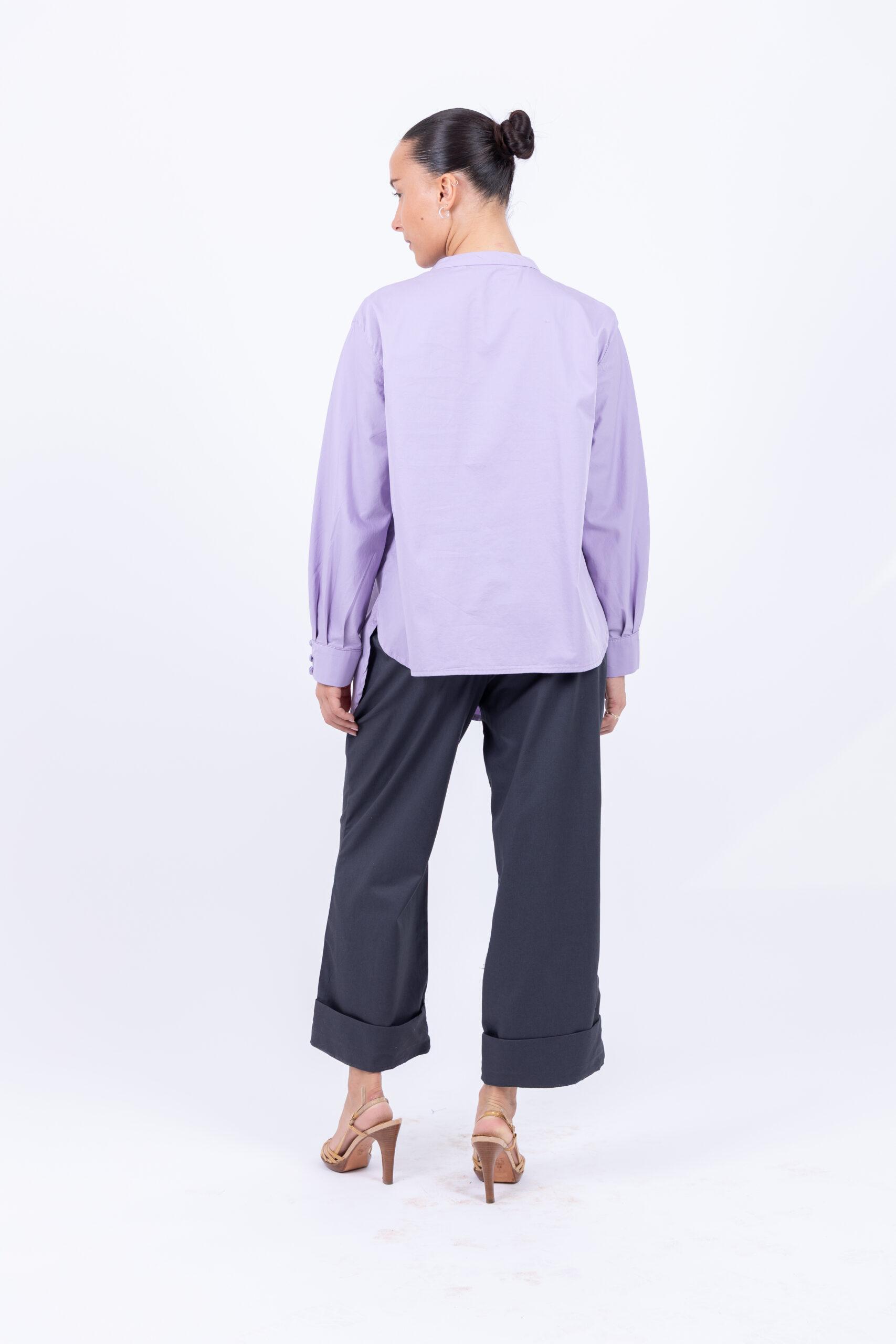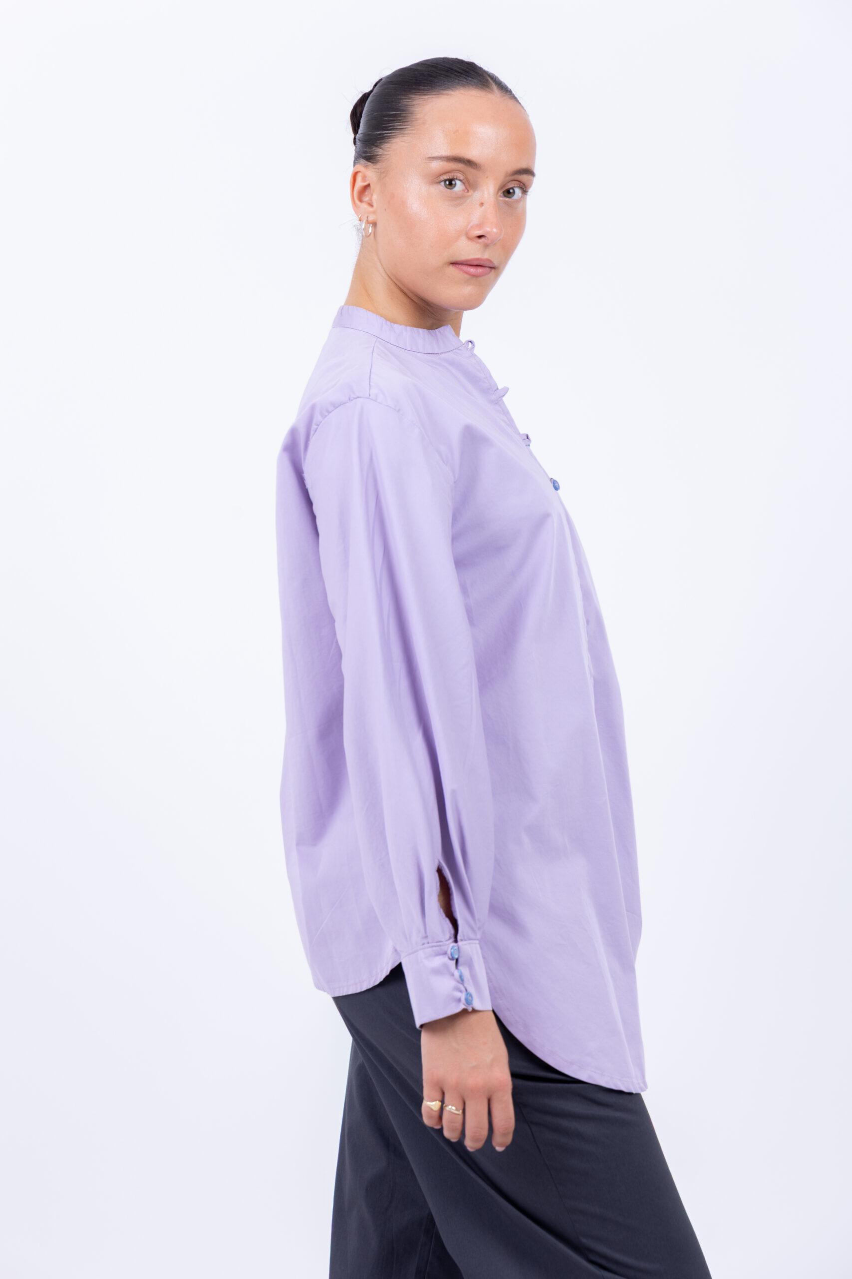 An elongated front that creates movement, a shorter back that keeps things modern—this is the shirt that bridges the gap between effortless and elegant. Light purple adds just enough softness without feeling precious.