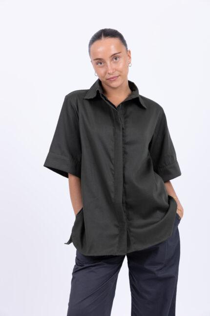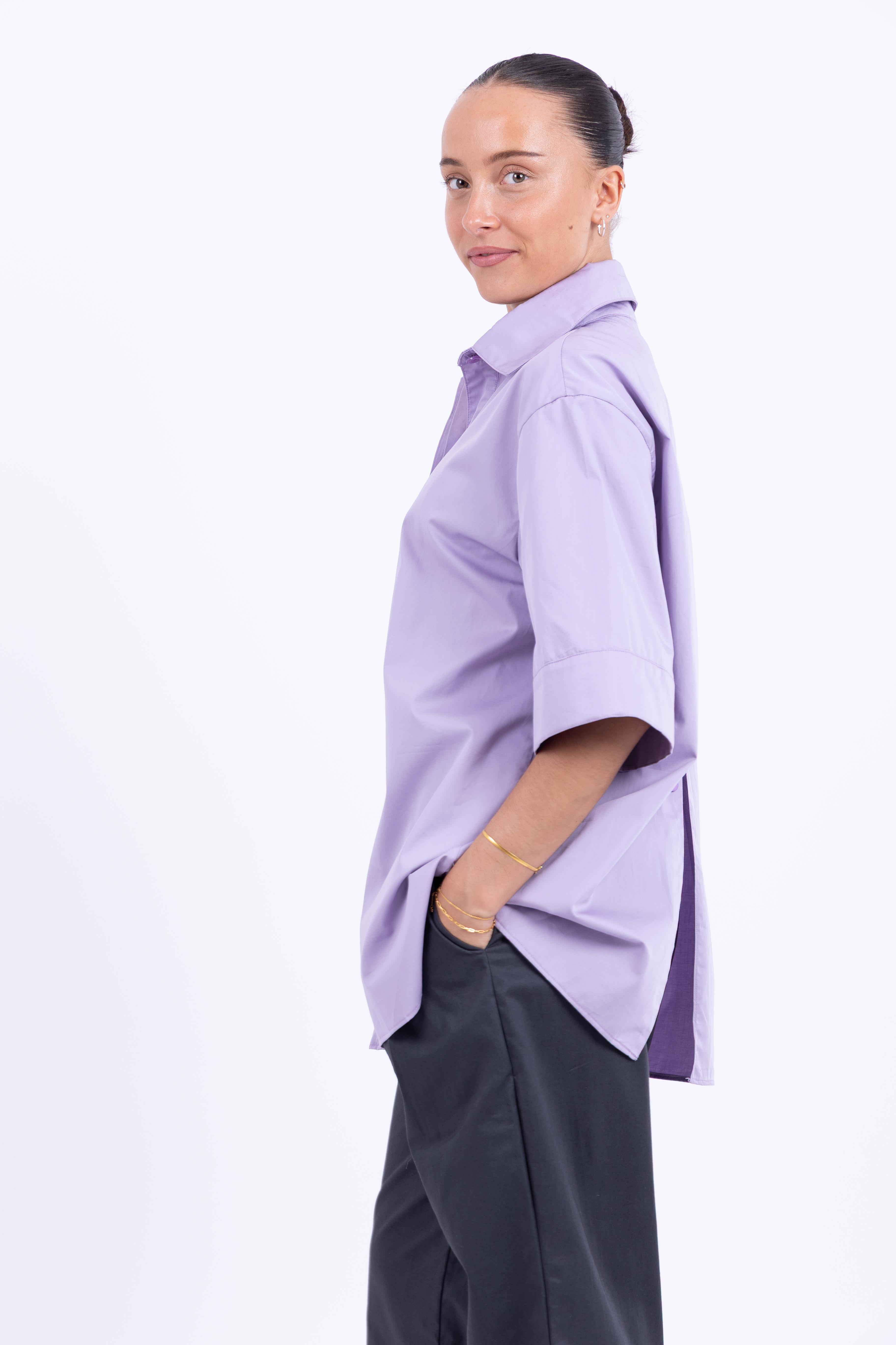 Loose, feminine fit keeps you comfortable through warm days and balmy evenings. The wide neck collar adds a soft, modern touch, while the back vent detail gives you options—wear it open for laid-back ease or buttoned for a cleaner finish.